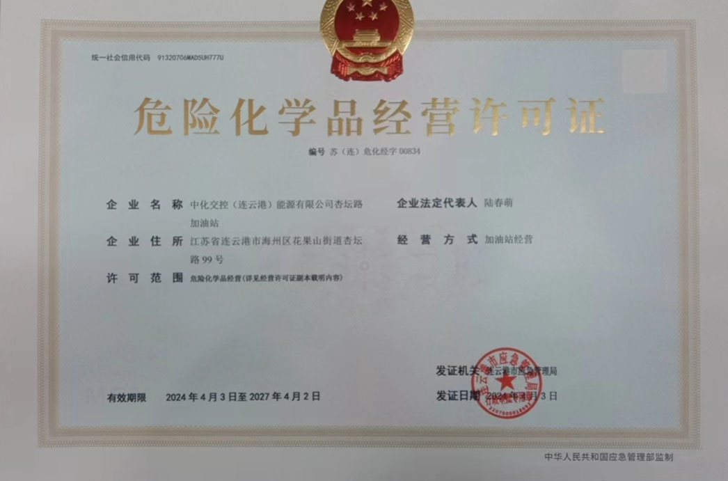 近日,經(jīng)過(guò)各部門(mén)的通力協(xié)作,位于圣湖路北、杏壇路西的中化交控(連云港)能源有限公司杏壇路加油站順利獲取危險化學(xué)品經(jīng)營(yíng)許可證,此次許可證的順利獲批,標志著(zhù)杏壇路加油站已具備合法經(jīng)營(yíng)危險化學(xué)品的資格,項目各項業(yè)務(wù)經(jīng)營(yíng)步入正軌。