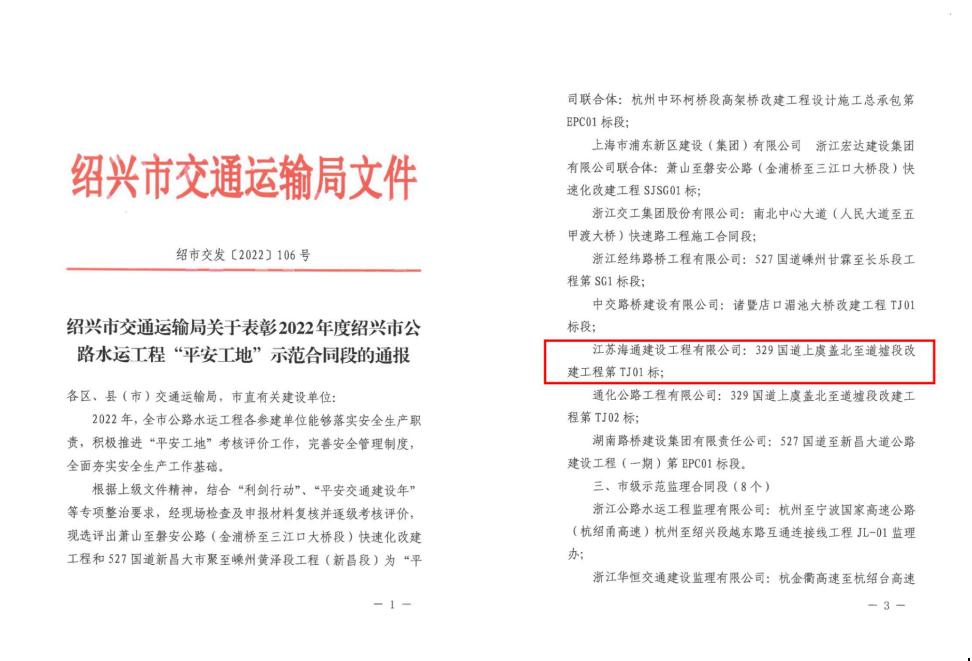 近日,從紹興市交通運輸局處獲訊,由江蘇海建公司承建的329國道上虞蓋北至道墟段改建工程第TJ01標榮獲紹興市市級示范“平安工地”稱(chēng)號。