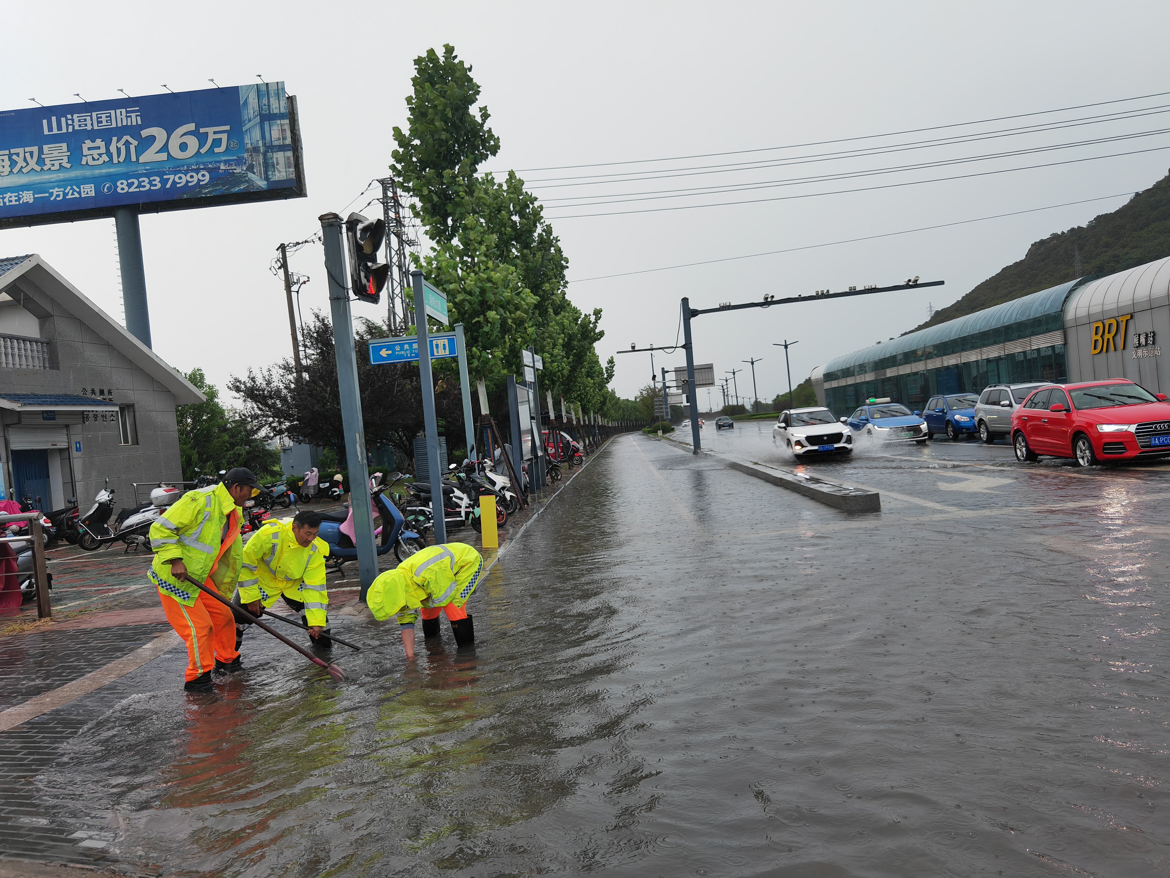臺風(fēng)來(lái)臨前,豐達公司對管養路段進(jìn)行全面隱患排查,重點(diǎn)檢查排水系統、泵站運行及施工現場(chǎng)安全,并提前調配應急物資和設備。暴雨來(lái)襲后,公司立即按照預案要求,組織150余名應急搶險隊員、14臺應急車(chē)輛、3套發(fā)電機組、8臺污水泵及800米水帶等搶險力量,迅速開(kāi)展道路巡查和險情處置工作。