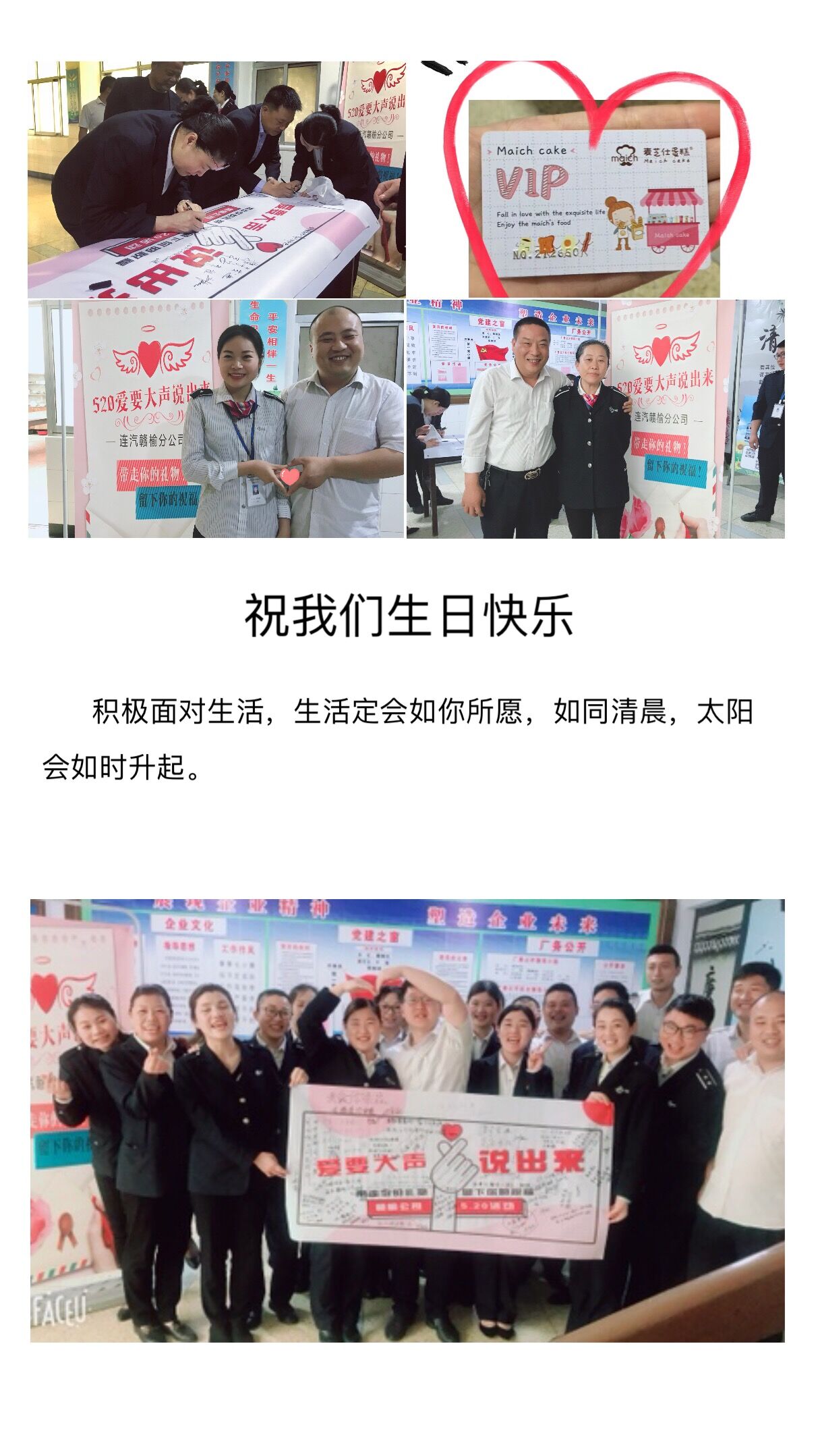 這一個(gè)周末的贛榆公司,與以往一樣安然,卻發(fā)生了不同尋常的浪漫驚喜,一份公司送給職工的溫暖,從這里出發(fā)。由贛榆公司工會(huì )為職工們舉辦的別樣生日祝賀活動(dòng)——給職工們送上生日蛋糕卡,從這樣一個(gè)特殊的日子啟動(dòng)。