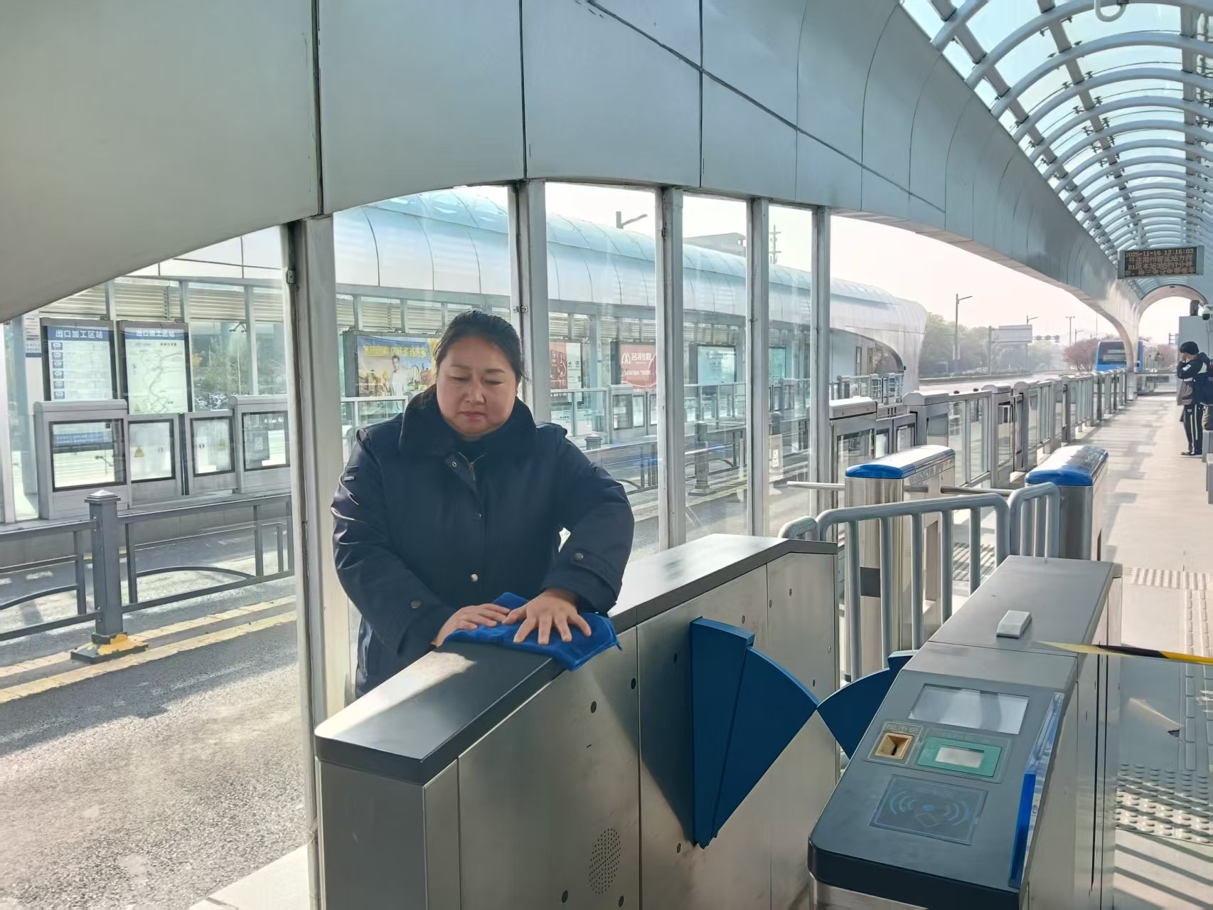 11月15日晚高峰,出口加工區下行站客流較多,當班站務(wù)員金莉正在忙著(zhù)引導乘客上下車(chē),解答乘客咨詢(xún)問(wèn)題。這時(shí)她突然觀(guān)察到在站臺座椅上有位老太太身子微微搖晃,臉色蒼白的嚇人,雙手緊緊按著(zhù)胸口,金莉趕緊飛奔進(jìn)站上前輕聲詢(xún)問(wèn):“阿姨,你是哪里不舒服嗎?需要幫您打120嗎?”老太太虛弱的搖搖頭,聲音微弱地說(shuō):“我中午忙沒(méi)趕上吃飯,現在頭很暈?!苯鹄蚺袛嗫赡苁堑脱欠噶?,她扶著(zhù)老太太坐穩,然后進(jìn)票房拿了幾顆水果糖,倒了杯溫水遞給阿姨。